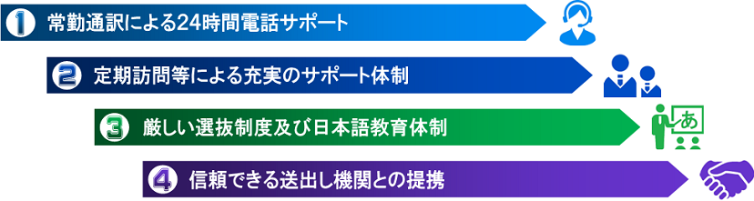 また、日本人職員による定期訪問だけではなく、常勤通訳の24時間サポートにより仕事面だけではなく生活面における指導やメンタルケアもしております。