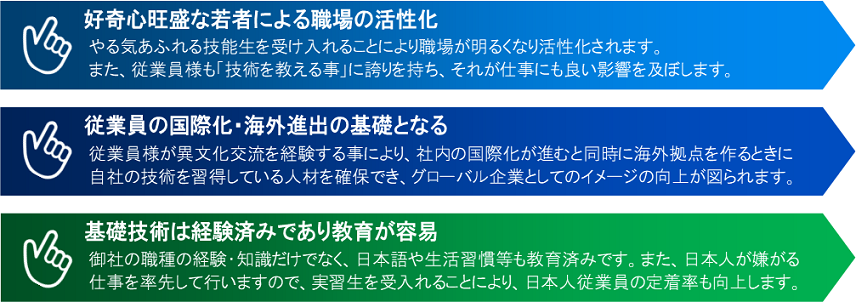 外国人技能実習制度を活用すると、主に以下の3つのメリットがあります。