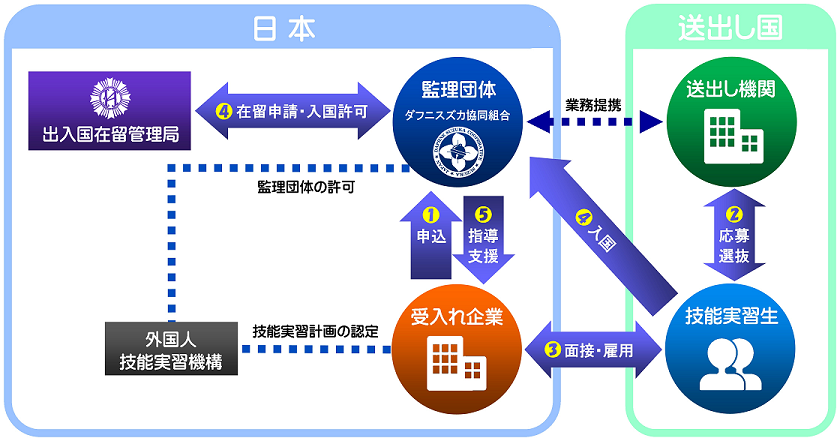 中部経済協同組合は、当組合が監理団体となり、技能実習生を受け入れ、傘下の企業等(実習実施者)で技能実習を実施する団体監理型をおこなっています。