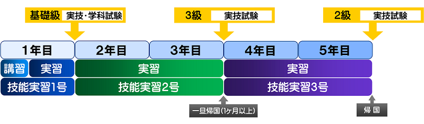来日後、日本語を中心に、日本での実習をスムースに行えるようにするための講習を、1ヶ月にわたり、組合の研修施設や提携施設を利用して組合主導で実施、入国後は、最長5年間(3年+2年)実習することが可能ですが、実習を継続するためには定期的に技能検定試験に合格する必要があります。