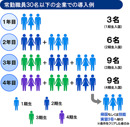 - 第1号技能実習生の人数が、常勤職員の総数を超えることはできません。また、第2号実習生数は常勤職員の総数の2倍、第3号実習生数は常勤職員の総数の3倍を超えることができません。